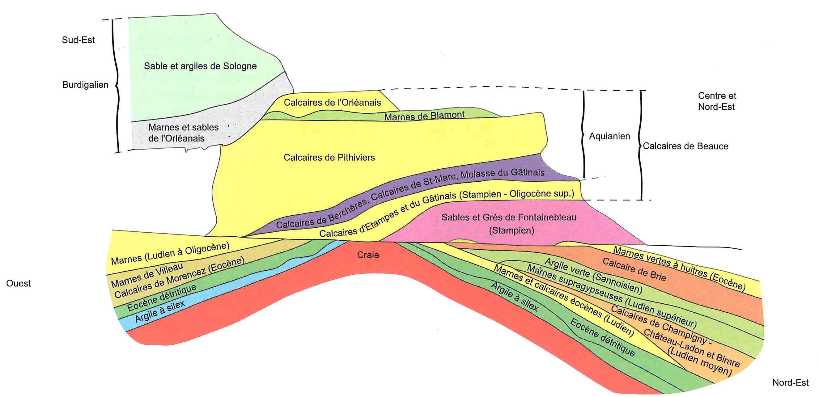 Le calcaire de Beauce correspond à l’extension d’un lac qui s’est formé entre 43 et 25 millions d’années (de l’éocène à l’aquitanien) dans la Beauce et aussi sur la majeure partie de la Sologne. La sédimentation calcaire atteint 200 m d’épaisseur au centre du bassin . Elle est interrompue par un épisode marin qui dépose les Marnes à huîtres et les Sables de Fontainebleau. Elle se termine par une émersion à laquelle correspondent des dépôts détritiques (Argiles et Sables de Sologne, du Mio-pliocène) apportés par les cours d’eau puis par la Loire depuis le Massif central, lesquels forment les terrains de la forêt d’Orléans.