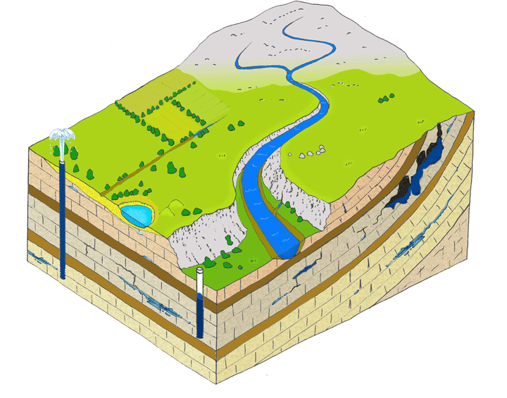 Le BRGM et le SIGES Aquitaine (Système d'information pour la gestion des eaux souterraines en Aquitaine) proposent de découvrir les différents accès aux eaux souterraines. Une rivière est un cours d’eau de moyenne importance qui se jette dans une autre rivière, un fleuve ou la mer. Un fleuve, lui, est un cours d’eau important qui se jette dans la mer ou les océans. Ils constituent tout deux des milieux particulièrement riches dans lesquels cohabitent d’importantes populations animales et végétales. Les cours d’eau sont en relation directe avec les réservoirs aquifères qu’elles recoupent (formations alluviales, calcaires,…). Les nappes qu’elles contiennent peuvent soit venir alimenter le débit des cours d’eau soit être rechargée par les rivières.