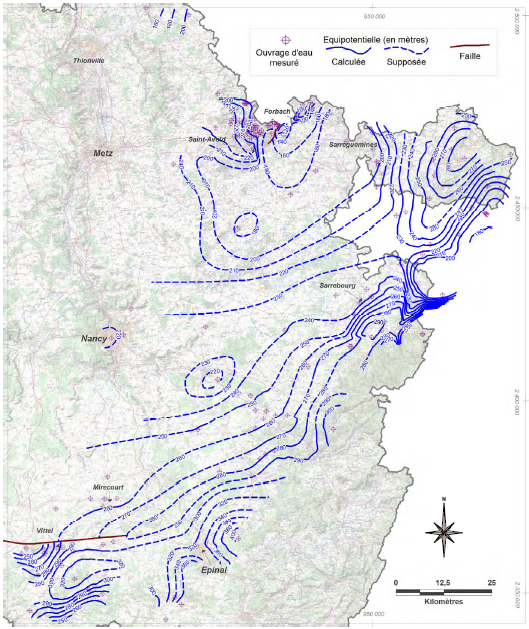 - nappe des calcaires du Dogger : la piézométrie moyenne interannuelle avant l’ ennoyage du bassin ferrifère issue de la synthèse cartographique à l’échelle 1/250 000 des réservoirs aquifères du bassin Rhin-Meuse (Le Nindre Y.M., rapport BRGM /RR-38618-FR) ;